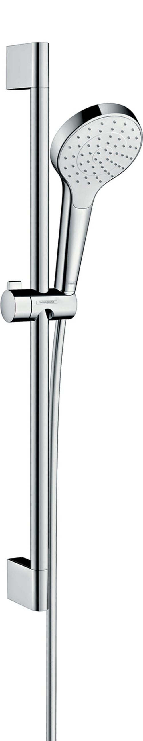 Barre de douche Croma 65 cm avec tuyau de douche (#26503000 ). Se compose de : douchette à main, barre de douche, tuyau de douche, curseur. tourbillon côté douche contre la torsion gênante du tuyau de douche.