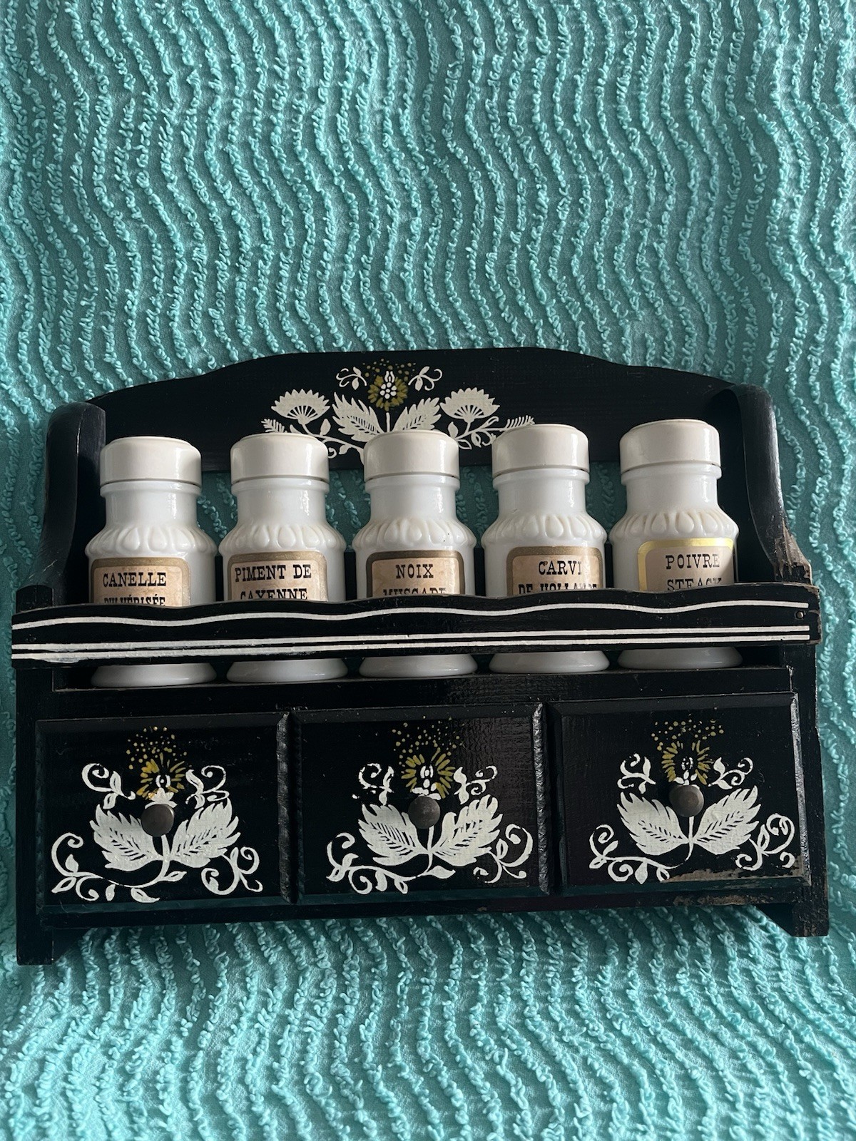 Ancien meuble, étagère à épices 3 tiroirs en porcelaine des années 50