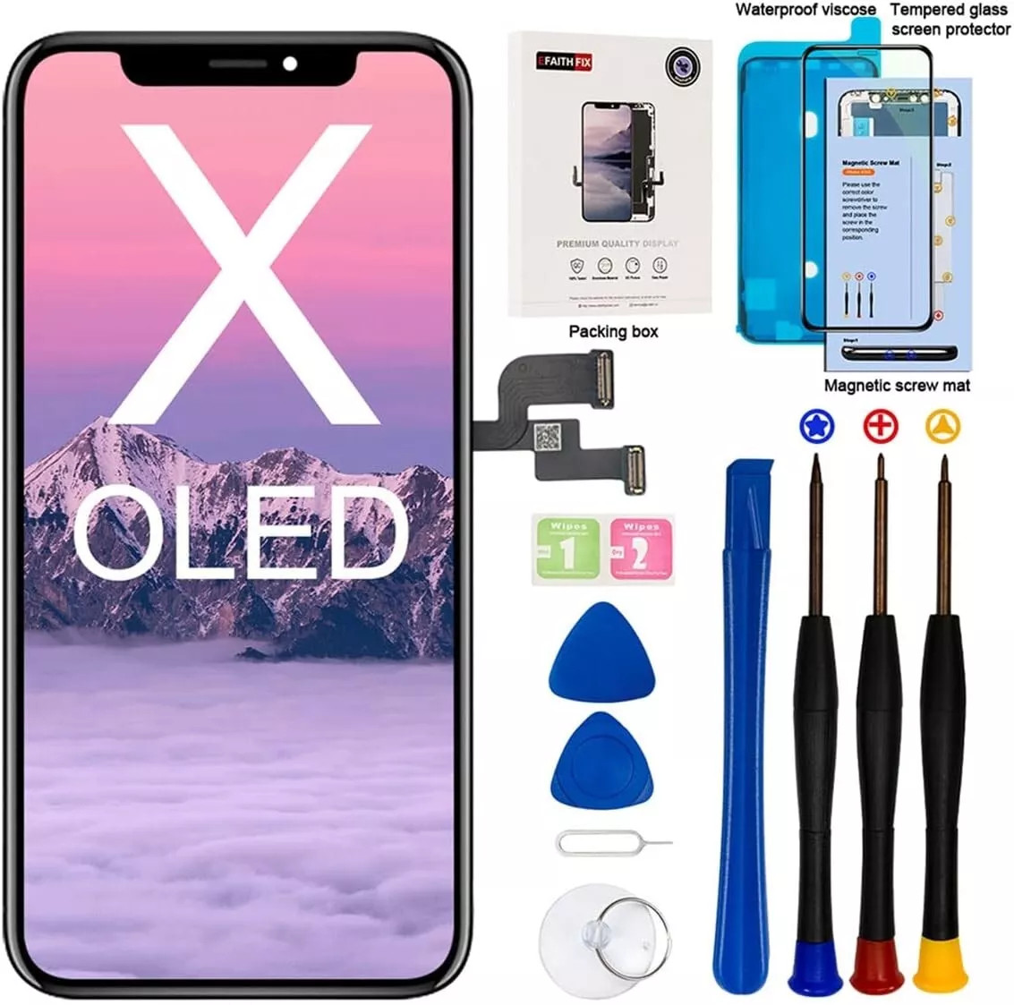 Type d'écran : OLED. Modèle compatible:Apple iPhone X. 1 tapis de vis magnétique+1 guide d'installation+1 film de protection pour verre trempé+1 autocollant de cadre résistant à l'eau+1 kit d'outils de réparation.