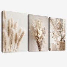 3Pcs Cadre en Bois Impression sur Toile Beige Boho Herbe de Pampa Tableau Ima...