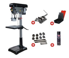 Perceuse à colonne professionnelle jusque ø 32 mm CM4 1,5 kW 230V + étau de perçage jeu de boulons jeu mêches aérosol Torros DF34M PACK